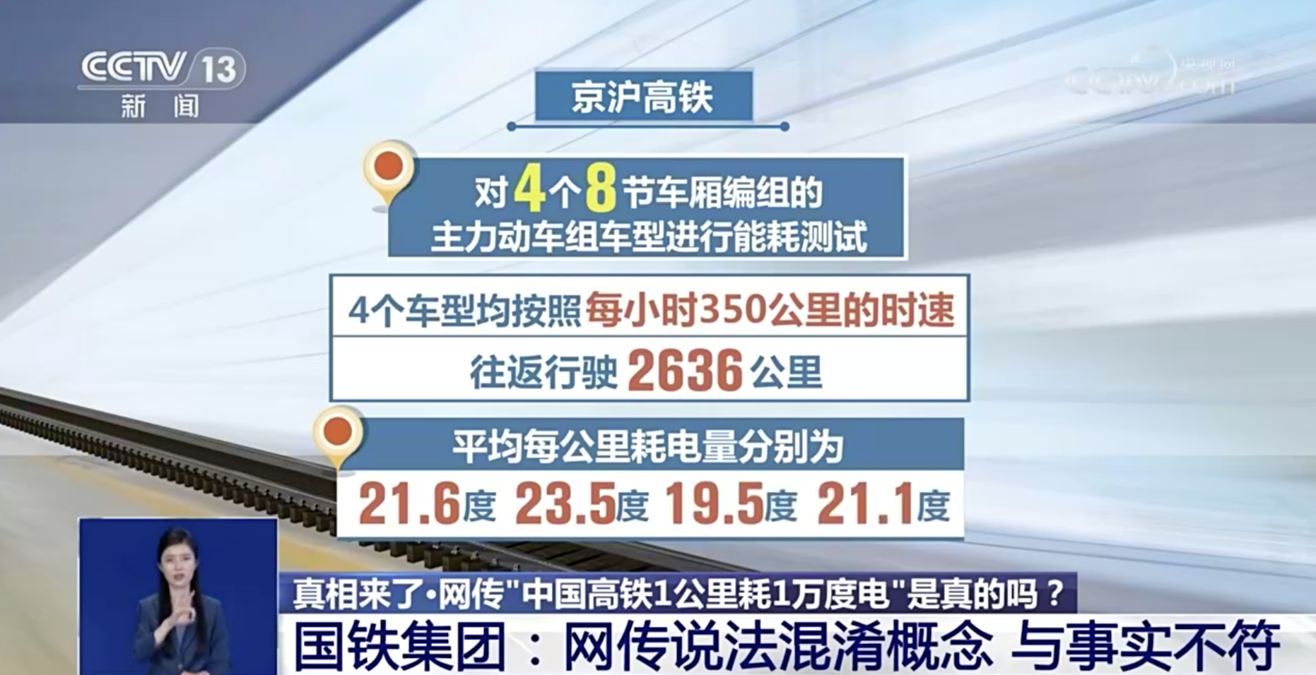 網(wǎng)傳“一公里耗一萬度電”的說法混淆了單位時間和單位里程兩個概念,與事實不符。如果按照單位時間來算,高鐵滿功率運行一小時,耗電量在一萬度左右。專家介紹,高鐵恒速運行過程中,并不需要始終保持滿功率,所以我國高鐵運行一小時的耗電量基本也不會到達一萬度。