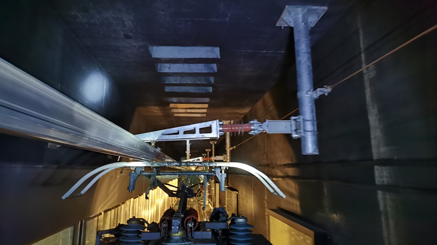 地鐵列車能夠穿梭于城市軌道交通線路網(wǎng)絡(luò),全靠電能驅(qū)動(dòng)。城市軌道交通供電系統(tǒng)一般通過車站變電所將35kV交流電轉(zhuǎn)換為1500V直流電后,通過安裝于隧道側(cè)下方的接觸軌系統(tǒng)或安裝于隧道頂部的接觸網(wǎng)系統(tǒng)給列車供電。城市軌道交通的接觸網(wǎng)一般采用匯流排+接觸線的型式,匯流排通過懸掛裝置固定在隧道上方,接觸線安裝在匯流排的底部凹槽內(nèi),列車通過頂部受電弓與接觸線接觸獲取電能。相對(duì)于鐵路工程懸掛接觸線的方式而言,這種安裝形式具有高強(qiáng)度和堅(jiān)固的特點(diǎn),因此這種方式又稱之為剛性懸掛式接觸網(wǎng),武漢市軌道交通6號(hào)線和19號(hào)線的地下區(qū)間即采用剛性懸掛式接觸網(wǎng)。