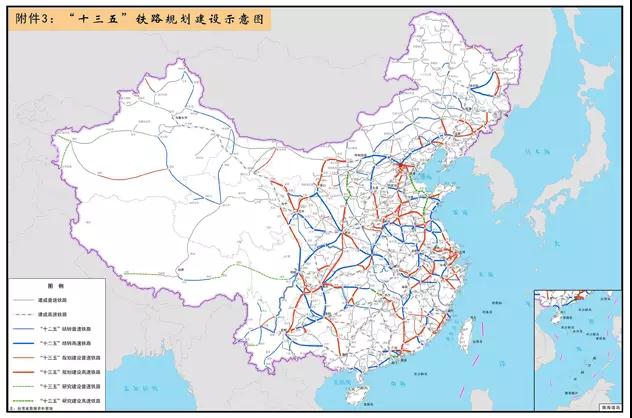 推進高速鐵路建設。加快高速鐵路網建設,貫通京哈—京港澳、陸橋、滬昆、廣昆等高速鐵路通道,建設京港(臺)、呼南、京昆、包(銀)海、青銀、蘭(西)廣、京蘭、廈渝等高速鐵路通道,拓展區域連接線,擴大高速鐵路覆蓋范圍。