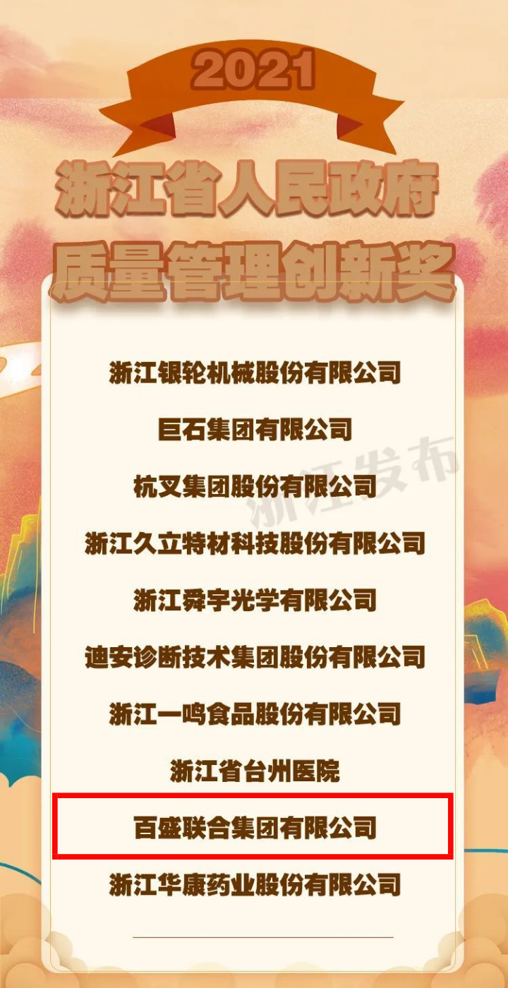 百盛聯合集團榮獲2021年浙江省人民政府質量管理創新獎