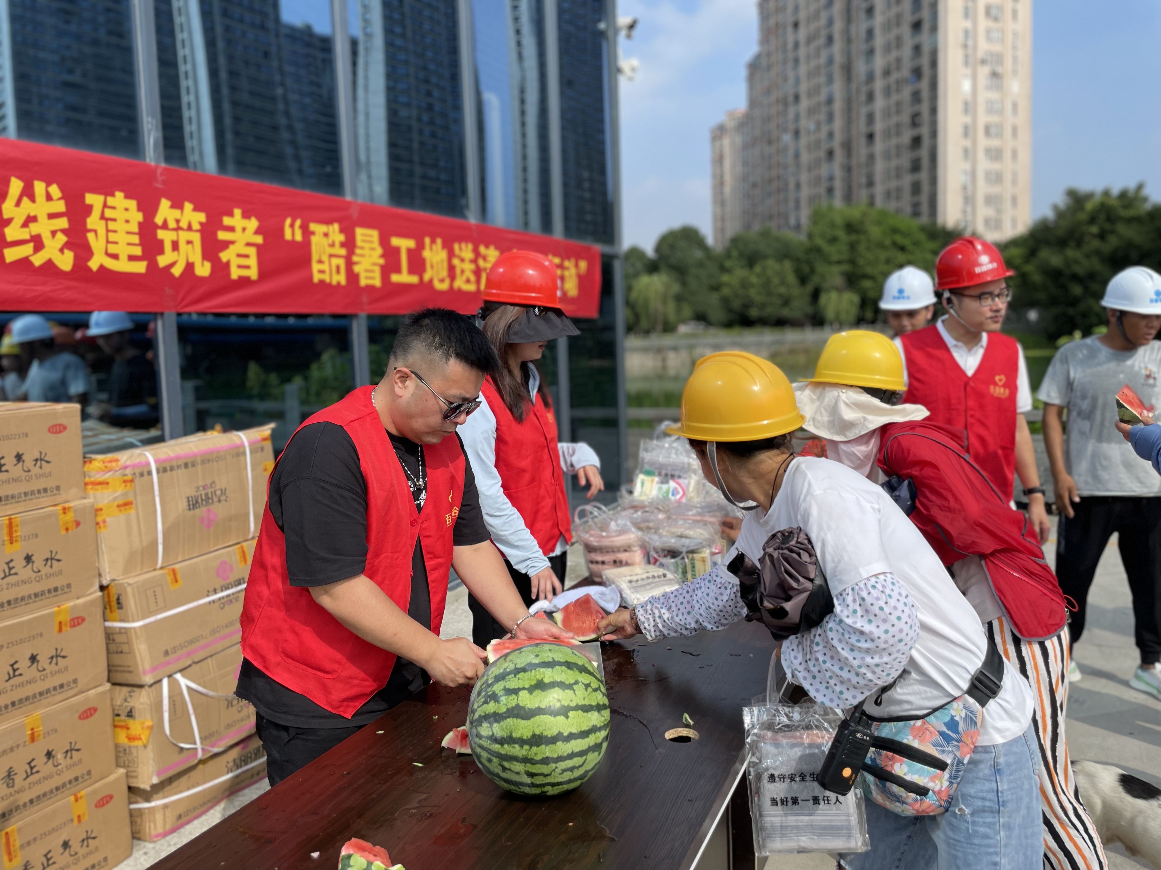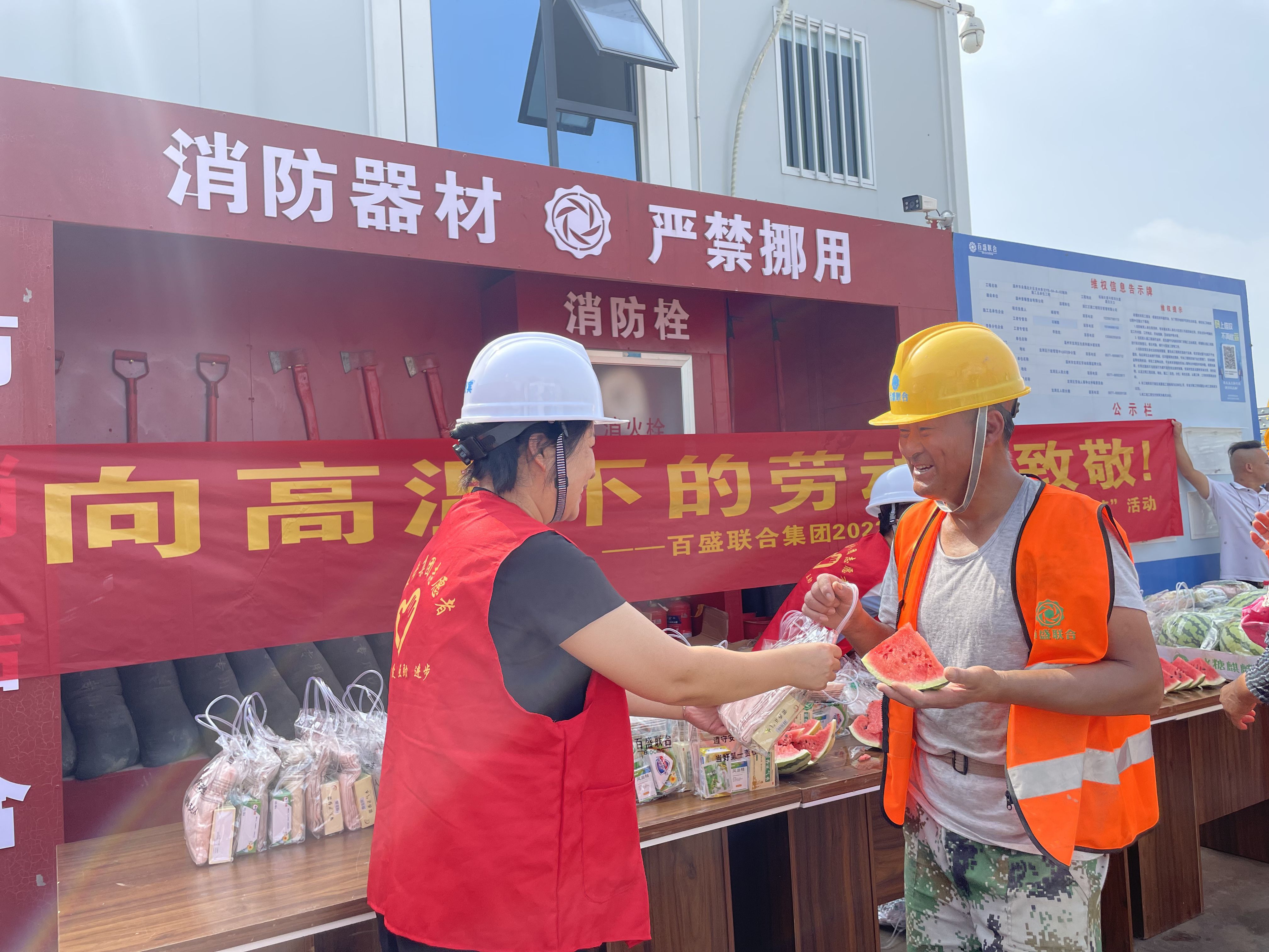 在蒲州街道嶼田村城中村改造項(xiàng)目和永強(qiáng)北片區(qū)龍水單元項(xiàng)目現(xiàn)場(chǎng),集團(tuán)董事長(zhǎng)盛星樂(lè)與工作人員一道,為一線(xiàn)職工送去礦泉水、藿香正氣水、龍虎人丹、西瓜等降溫用品。同時(shí),對(duì)所有戰(zhàn)高溫、冒酷暑、保建設(shè)的工作者表示感謝,并叮囑他們要注意自身健康和安全,做好高溫防暑防護(hù)。
