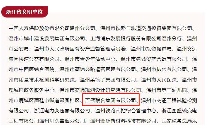 近日,中共浙江省委、浙江省人民政府發布《關于表彰浙江省文明城市、文明村鎮、文明單位、文明家庭、文明校園的通報》,百盛聯合集團有限公司榜上有名,榮獲“浙江省文明單位”榮譽稱號。
