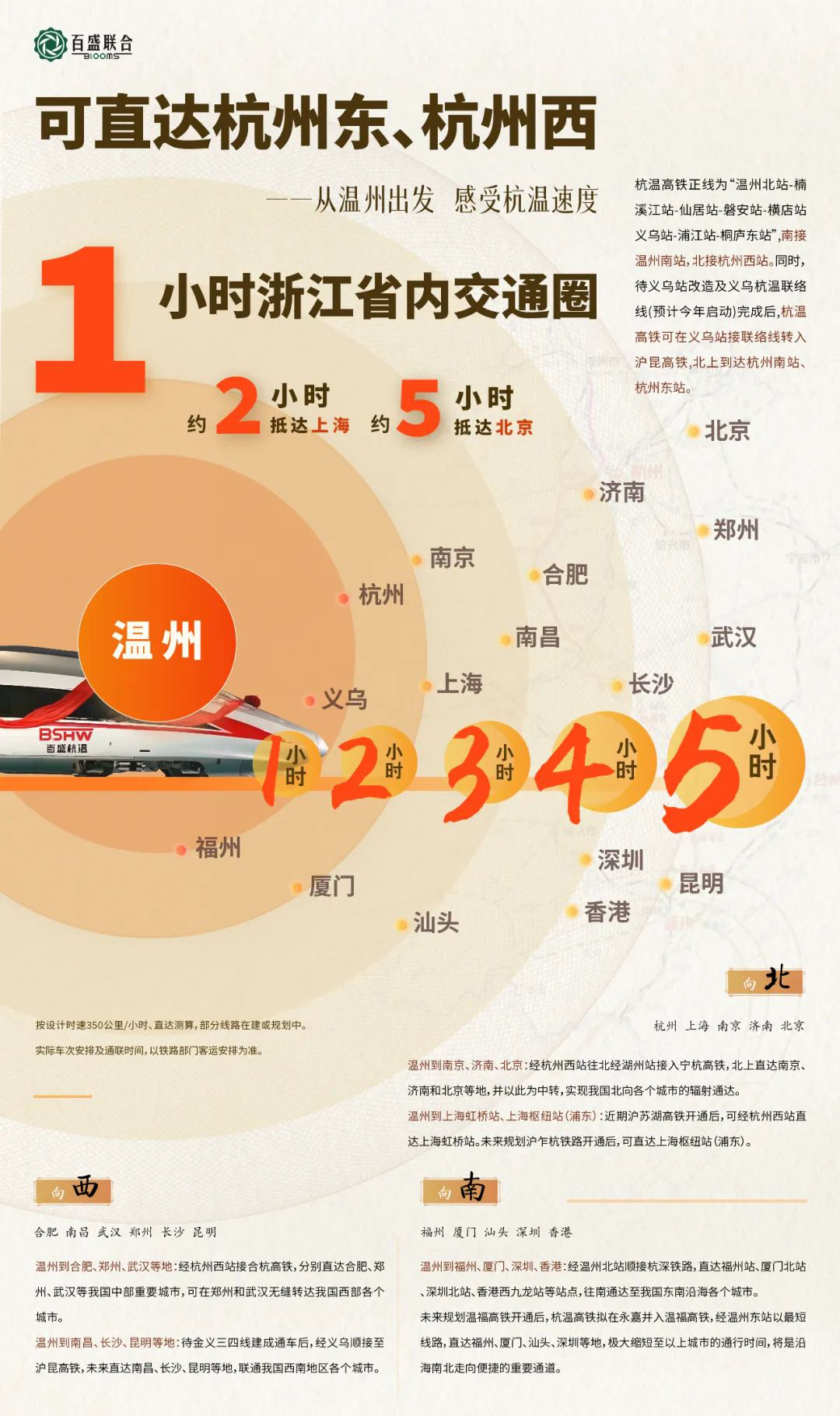 由百盛聯合集團投資建設的杭溫高鐵即將正式通車。作為國務院混合所有制改革試點和國家發改委社會資本投資示范項目,杭溫高鐵是國家“八橫八縱”鐵路網重要組成部分,是浙江省實現“省域1小時交通圈”的關鍵工程。其正線為“溫州北站-楠溪江站-仙居站-磐安站-橫店站-義烏站-浦江站-桐廬東站”,北接杭州西站,南接溫州南站,并可在義烏站轉入滬昆高鐵,直達杭州東站、杭州南站,使溫州至杭州的通行時間縮短至約1小時。
