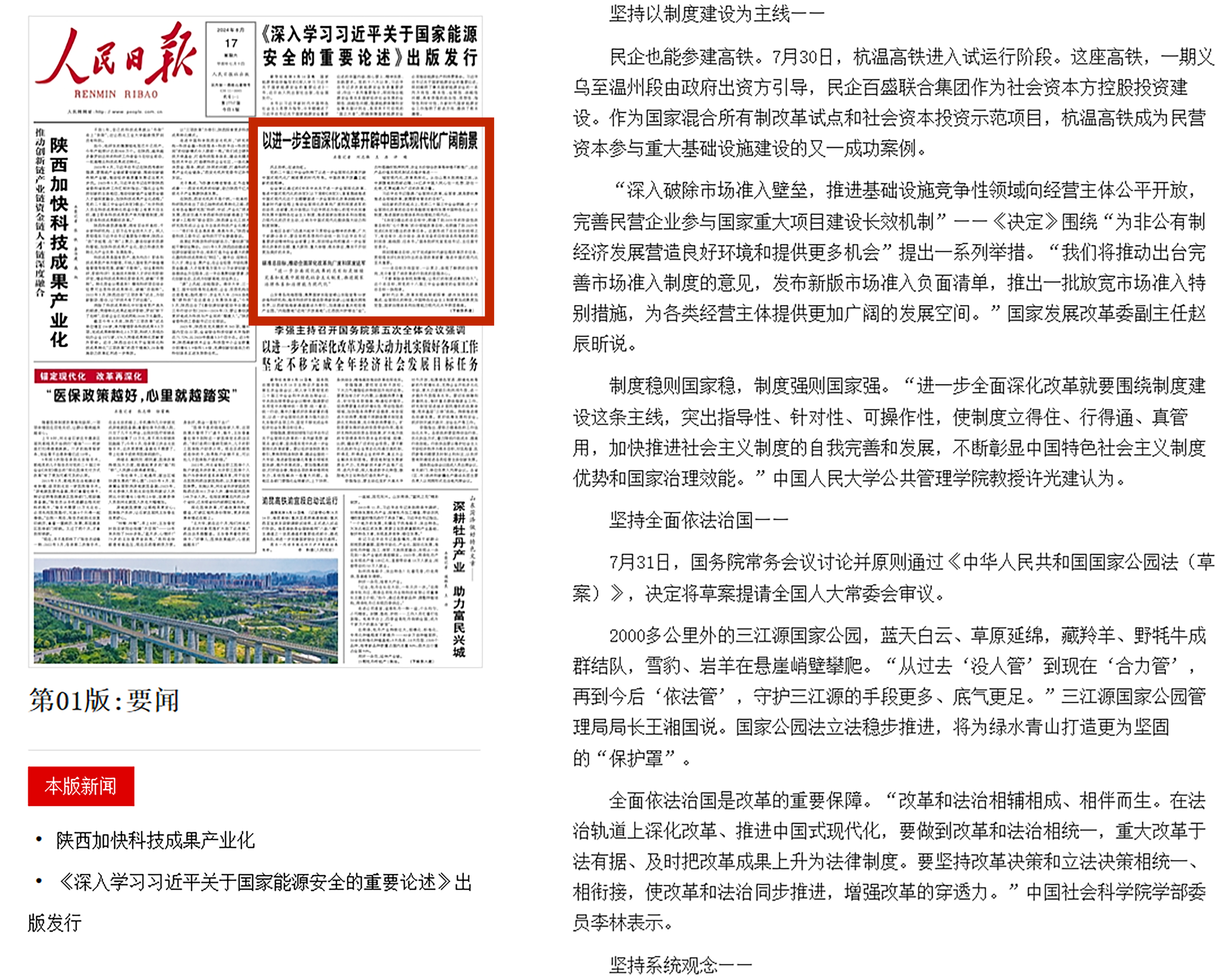 “進一步全面深化改革,要緊緊圍繞繼續完善和發展中國特色社會主義制度、推進國家治理體系和治理能力現代化的總目標,堅持以制度建設為主線,加強頂層設計、總體謀劃,破立并舉、先立后破,固根基、揚優勢、補短板、強弱項,筑牢根本制度、完善基本制度、創新重要制度,不斷把我國制度優勢更好轉化為國家治理效能,使中國特色社會主義制度更加鞏固、優越性充分展現。”中央黨史和文獻研究院學術和編審委員會原主任陳理說。