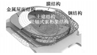 體育場平面為不規則五邊形,下部為4層混凝土結構看臺,上部為鋼結構罩棚。罩棚以V形柱及受壓環梁為界,分為外圈鋼結構和內圈鋼結構。