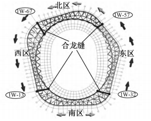 根據施工分區設置4條合龍縫,如圖2所示,單條合龍縫由內向外合龍。合龍縫部分桿件吊裝至高空后,通過臨時卡板及安裝螺栓固定,待合適的合龍時間再進行桿件對接焊接。