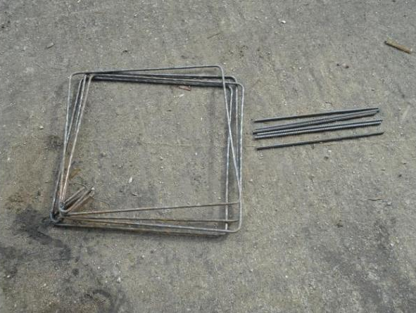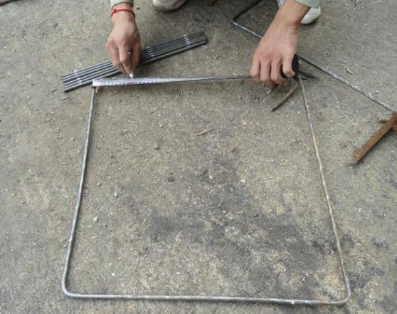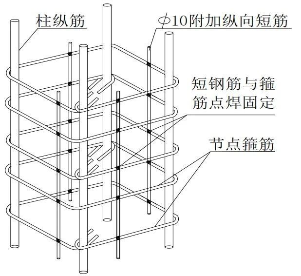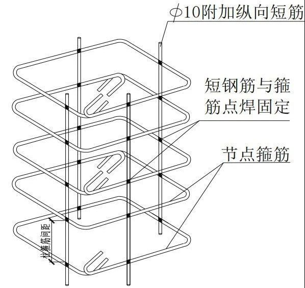 首先,根據施工圖和下料清單,按每個梁柱節點水平箍筋的間隔尺寸和型式制作單個箍筋,然后,利用鋼筋頭加工形成縱向短筋。