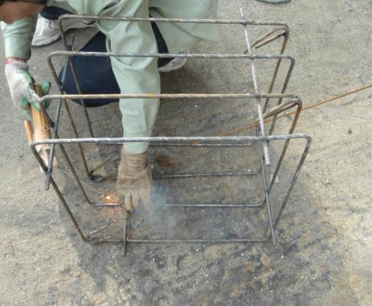其次,根據圖紙設計要求,將縱向短筋與箍筋按間距、位置焊接,得到柱箍筋骨架鋼筋籠。